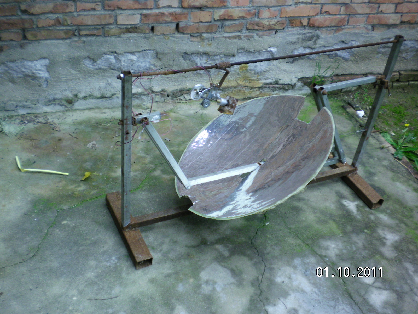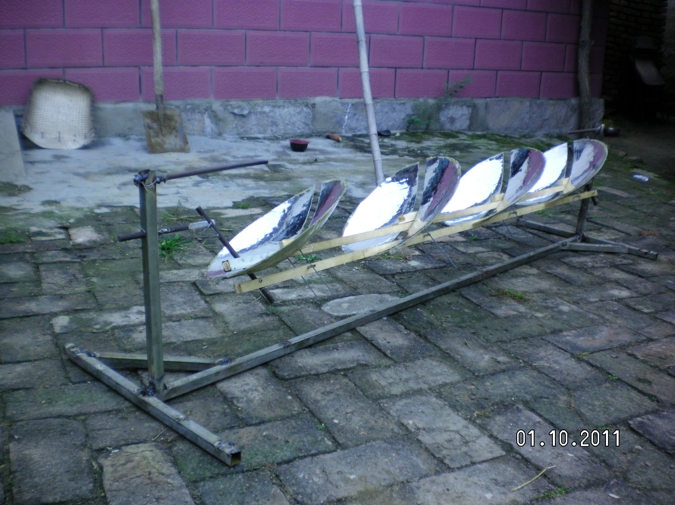 隨著全球環(huán)境惡化和日益嚴(yán)峻的能源形勢世界各國對太陽能熱發(fā)電越來越重視。現(xiàn)在最常用的太陽能熱發(fā)電系統(tǒng)主要有槽式、蝶式和塔式,槽式和蝶式的光熱部件必須隨聚光鏡做相應(yīng)的運動,槽式各個光熱部件復(fù)雜昂貴,蝶式光熱部分只能單獨使用塔式的受熱部分出現(xiàn)故障很難維修這三種系統(tǒng)都有自己的缺點?;诖宋以O(shè)計了平行定焦太陽能聚光集熱發(fā)電系統(tǒng):主要有一對支柱.一對轉(zhuǎn)軸.一對動臂.旋轉(zhuǎn)拋物面聚光鏡.一根托桿.一根平行桿.平行連桿組成將兩支柱固定在一條直線上,兩轉(zhuǎn)軸安裝在兩支柱上兩轉(zhuǎn)軸可以左右轉(zhuǎn)動,兩動臂安裝在兩轉(zhuǎn)軸上使可以隨轉(zhuǎn)軸左右前后擺動。托桿安裝在兩動臂上,平行桿與托桿平行安裝在兩動臂上,這樣動臂.托桿.平行桿構(gòu)成一個平行凹框。在旋轉(zhuǎn)拋物面鏡原點安一橫軸并切去部分旋轉(zhuǎn)拋物面鏡,在橫軸兩端垂直安裝兩根平行連桿,把旋轉(zhuǎn)拋物面鏡的橫軸安裝在托桿上。在平行桿上安裝連桿軸把平行連桿與連桿軸連接在一起。所述旋轉(zhuǎn)拋物面鏡的焦距等于托桿與轉(zhuǎn)軸之間動臂的長度。將動臂對準(zhǔn)太陽陽光就會聚焦到固定點上在這些位置安裝光熱部件就會得到熱能用于熱發(fā)電。這種結(jié)構(gòu)是雙軸定焦所以效率很高,抗風(fēng)性好。這種結(jié)構(gòu)可以做成很小裝在高在15-20cm的透明罩內(nèi)安裝在樓頂或樓房南墻上,為人們提供開水或蒸汽。請看模型照片: